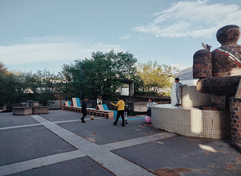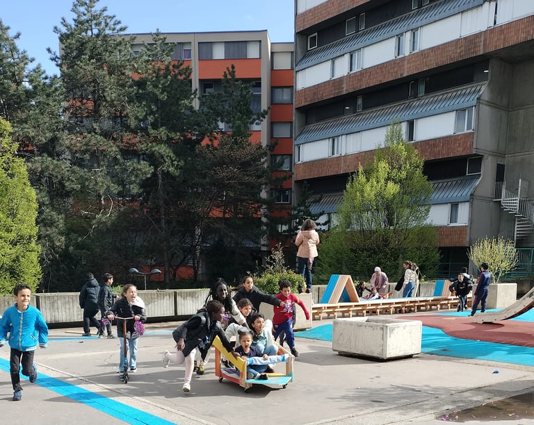 [EN] The 'Banc des Géants' project was designed by the Bruit du Frigo collective. It is a precursor to the project to plant and rehabilitate the square being led by the Base landscape agency. Above all, it is a pretext for bringing local residents together, enabling them to meet with Grenoble metropolitan authorities, while building with them and for them. This mediation project is part of the consultation work carried out by the Ateliers [dé]concertants.