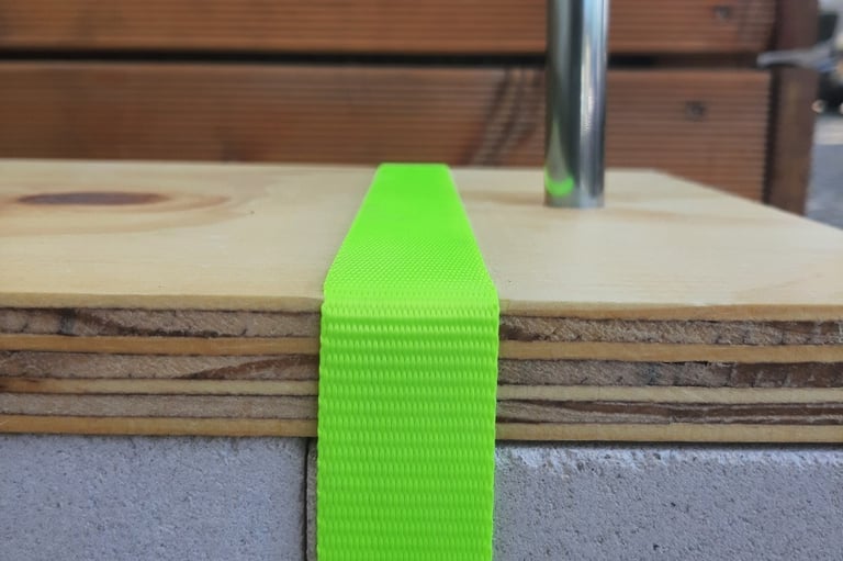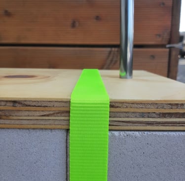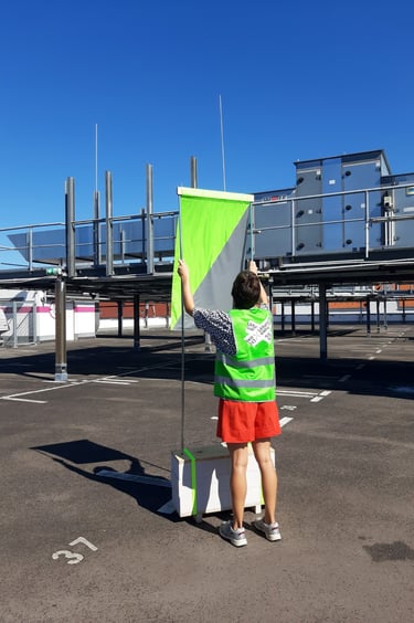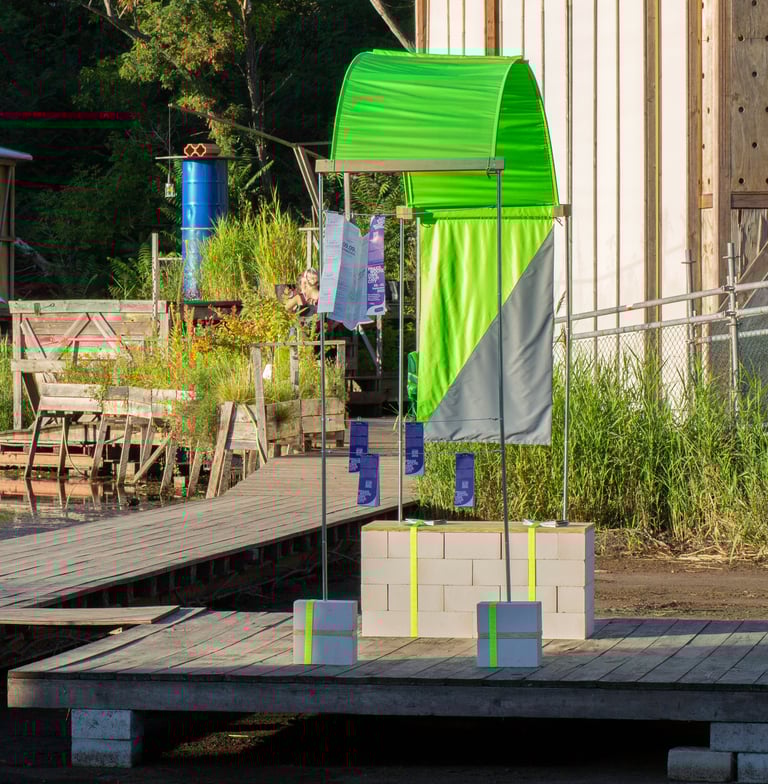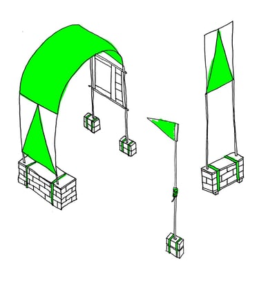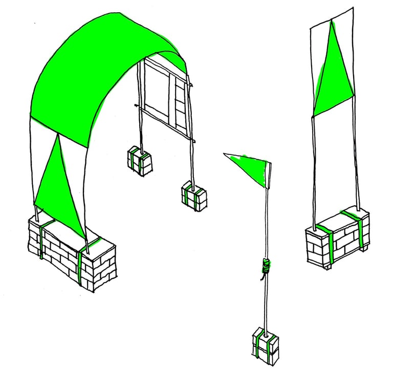 [EN] All the landmarks have been developed according to the same visual identity, so that they can be easily recognised wherever they are located in the city. The visual identity of each entity is defined by the choice of colours (neon green and grey) and materials used (a combination of sand-lime bricks, plywood, textiles and camping poles and hoops).