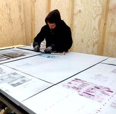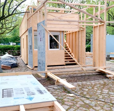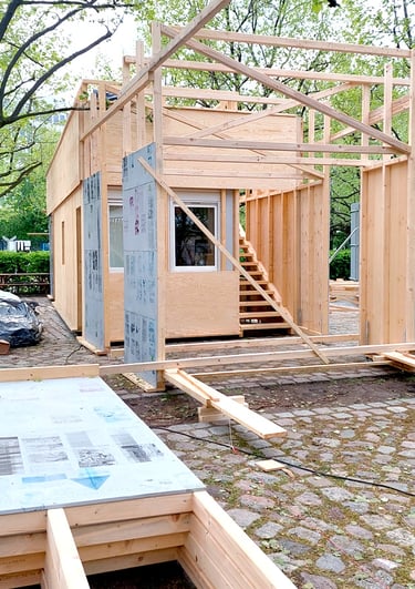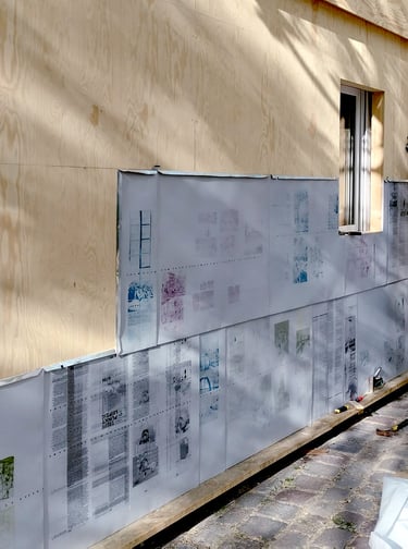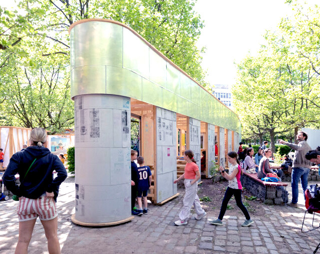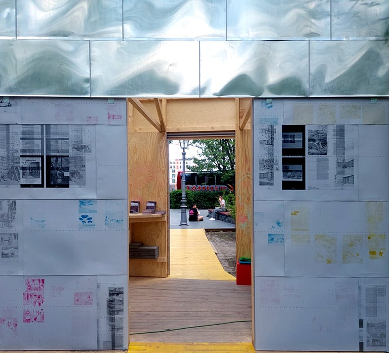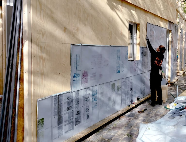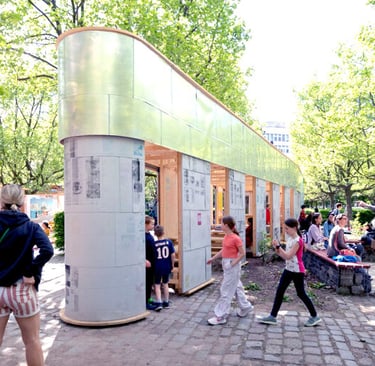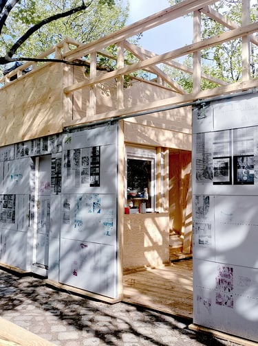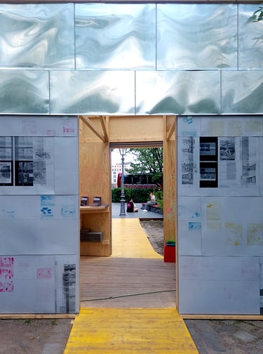 [EN] A new public space has been designed to rethink the car park adjacent to the Martin-Gropius-Bau museum. For several trial-months, pavilions have been set up on the paving stones: a halfpipe, a fountain, a workshop, event venues, a community pavilion, etc. We had the pleasure of taking part in the construction of the latter. Based on a container located on site, we took part in the construction and extension of its facade and cladding made from recycled offset paper, the fitting out of its outdoor "dining room" and its roof terrace.