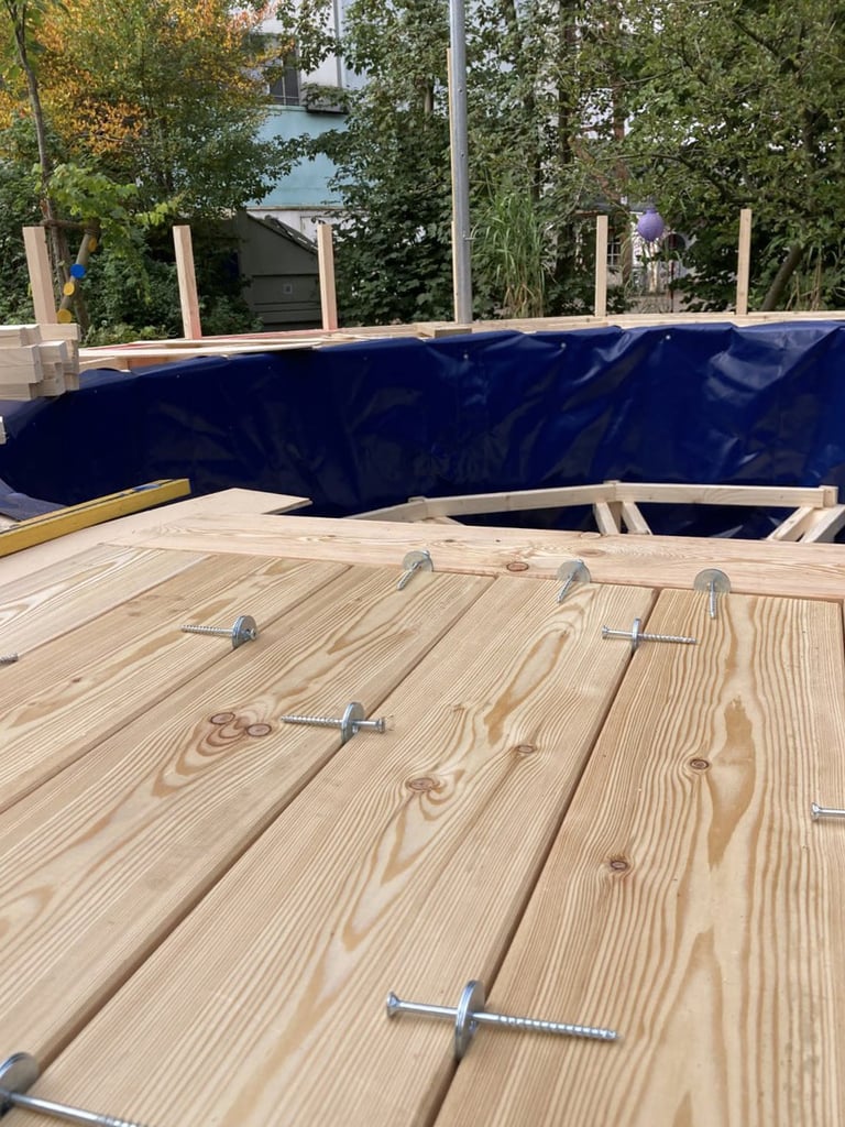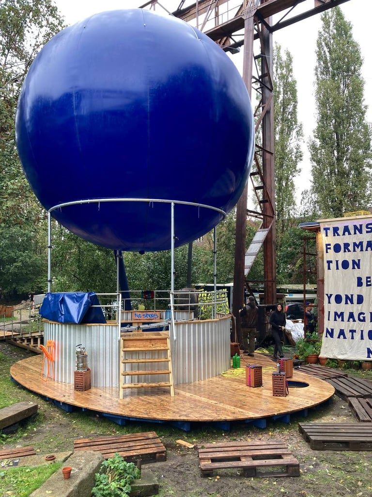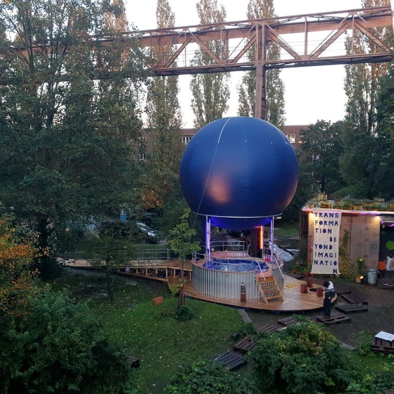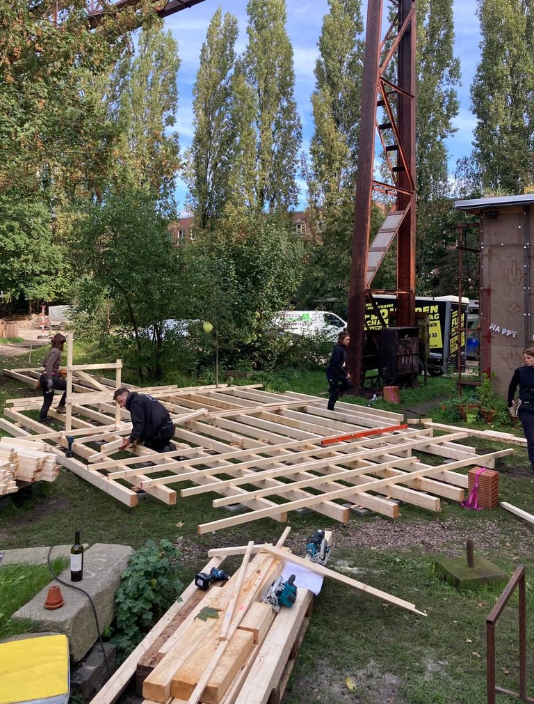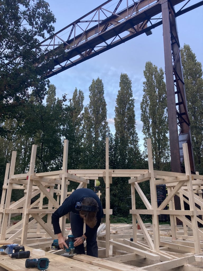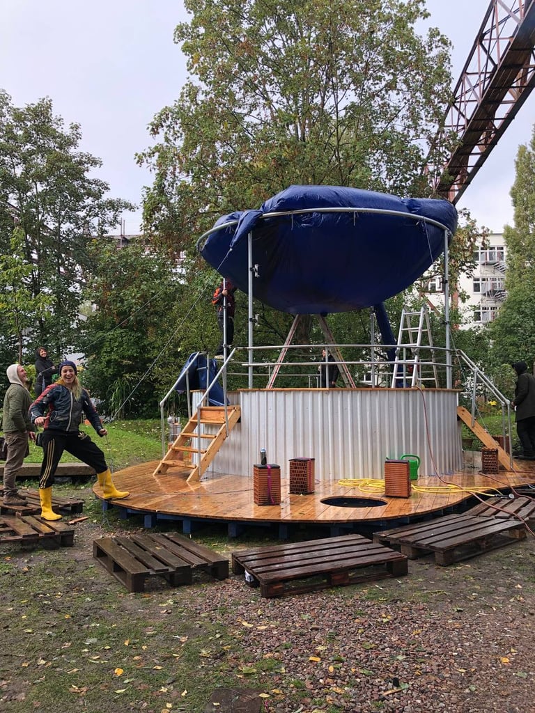 Intervention de préfiguration du vaste projet de rénovation et d'agrandissement de la maison de production internationale Kampnagel, le projet Kläranlage a été construit pour proposer un lieu de convivialité, de bien-être et de débat en extérieur, accessible en toute saison. Un bain circulaire chauffé par un poêle à bois, une plateforme et une rampe d’accès ont ainsi été réalisés avec des camarades de La Relève, d’après les idées et les plans des architectes de l’équipe de raumlaborberlin.