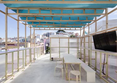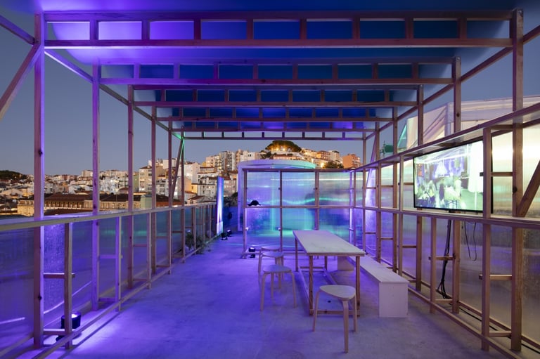 Des volumes simples et colorés s’insèrent dans un décor brutaliste pour rendre l’espace plus dynamique et abriter les nombreux éléments du programme tels qu’une scène, des salles de workshops et de conférences, une galerie NFT, une zone pour expérimenter la réalité virtuelle, une boutique, un espace lounge et une vaste terrasse en rooftop ouverte sur la ville.