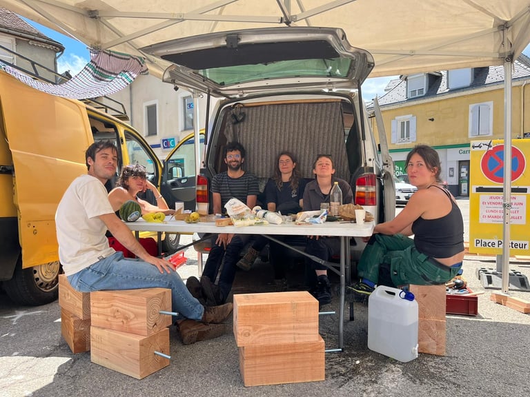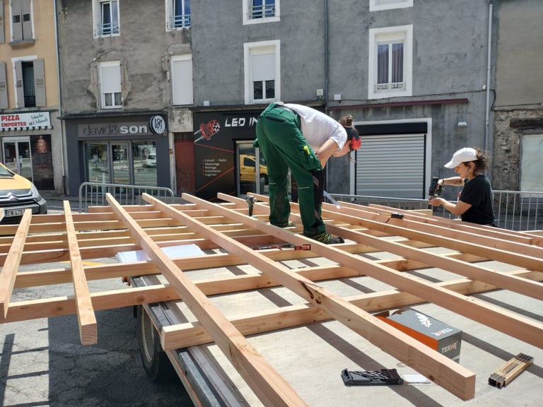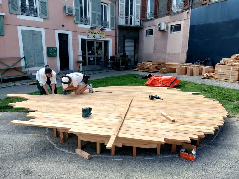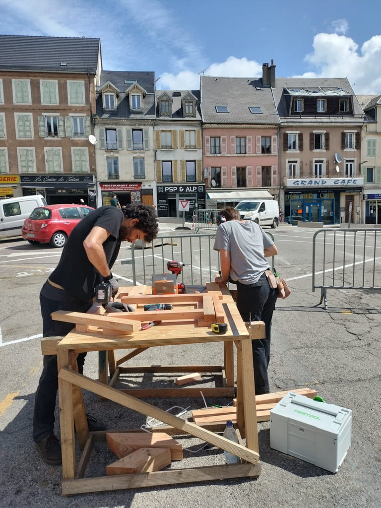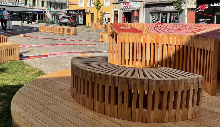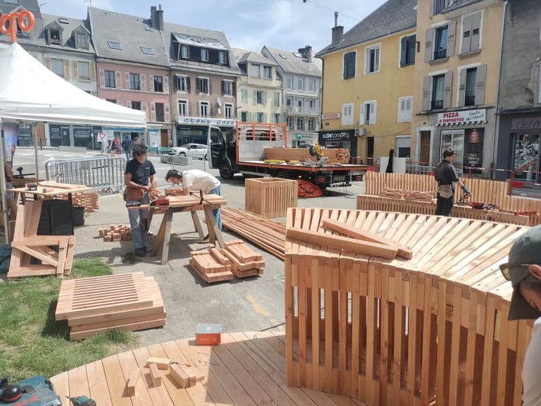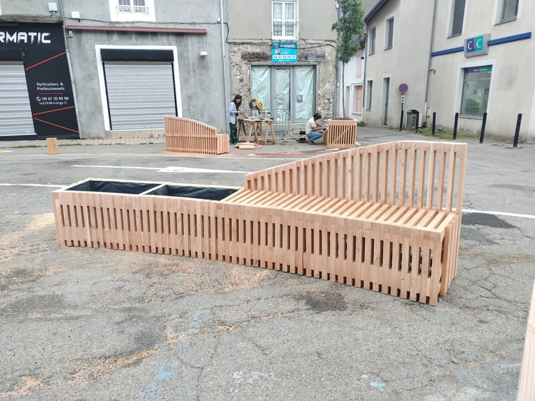 C’est dans l’optique d’une re-piétonisation d’une partie de la place Pasteur que nous avons été missionné.es de construire du mobilier urbain intégré à la place Pasteur en fort dénivelé. Des bancs, des jardinières et une table d’orientation ont ainsi été construits et implantés sur le site, pour inviter les Muroises et Murois à se réapproprier ce coin de ville, jusqu’alors réservé aux voitures.