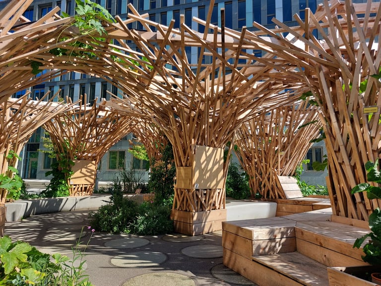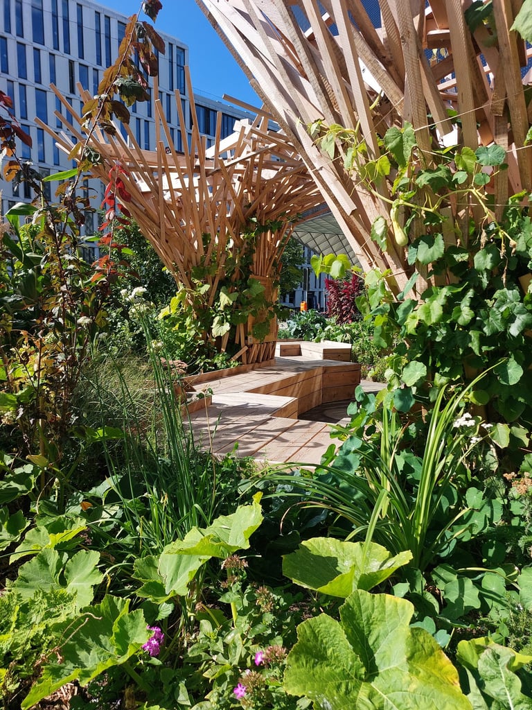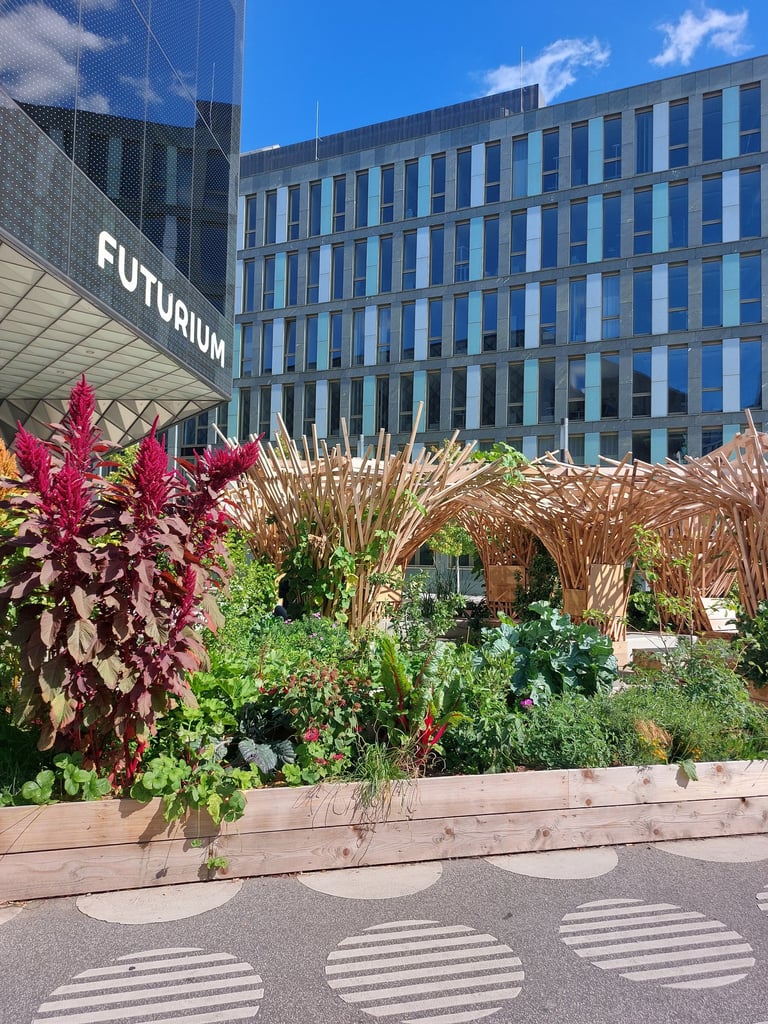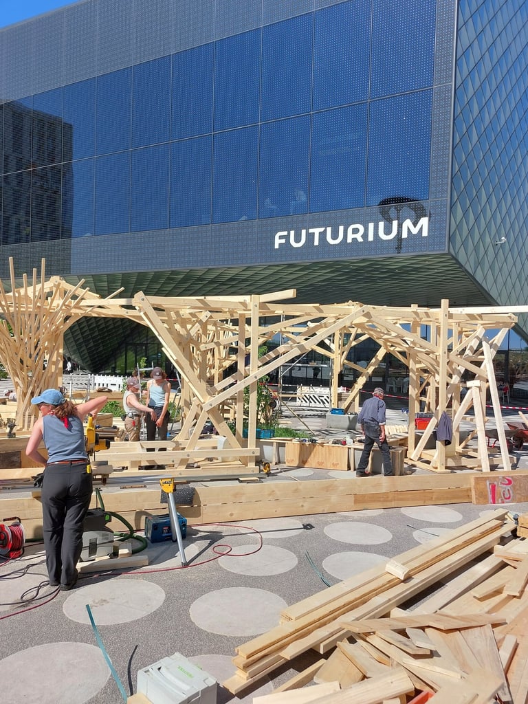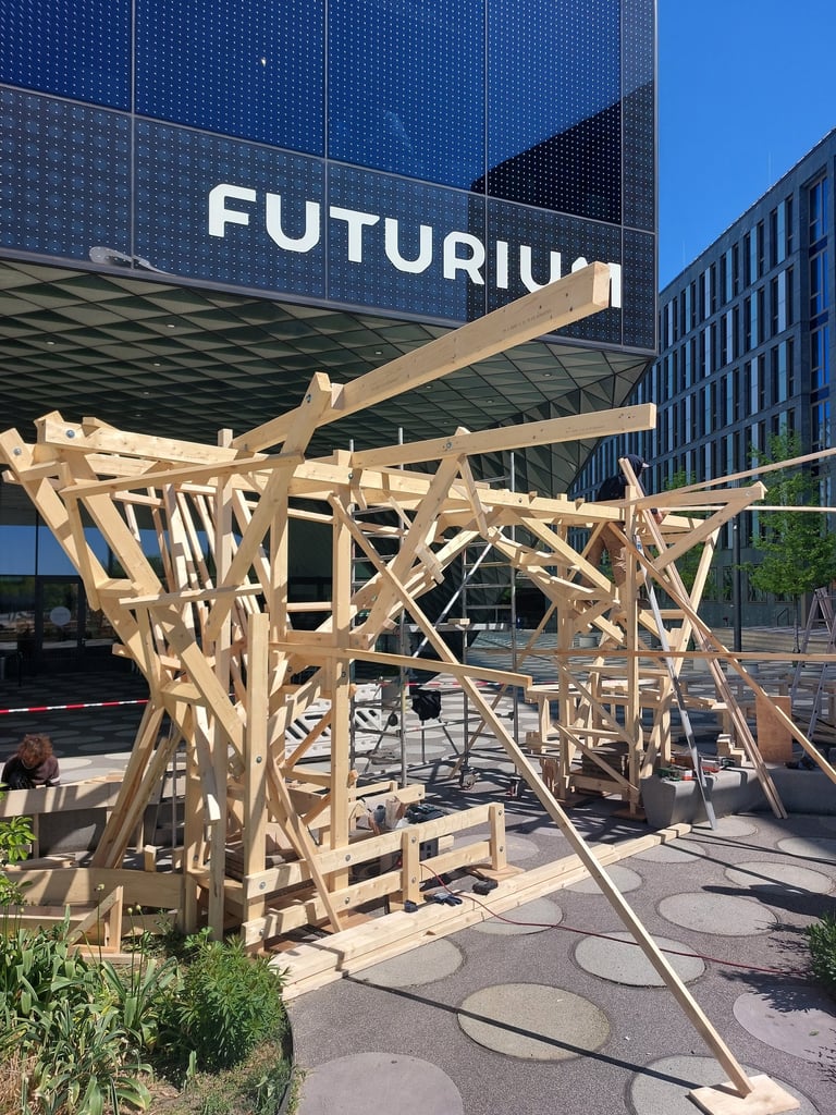 Le chantier Superland s'est déroulé en avril 2025 sur le parvis du "Futurium", en plein centre de Berlin. Nous avons pris part à la construction d'une forêt en bois et de bacs plantés, conçus par Benjamin Frick (Kaputt Kassette Records) et les paysagistes de Parzelle X.