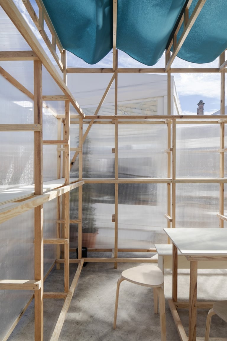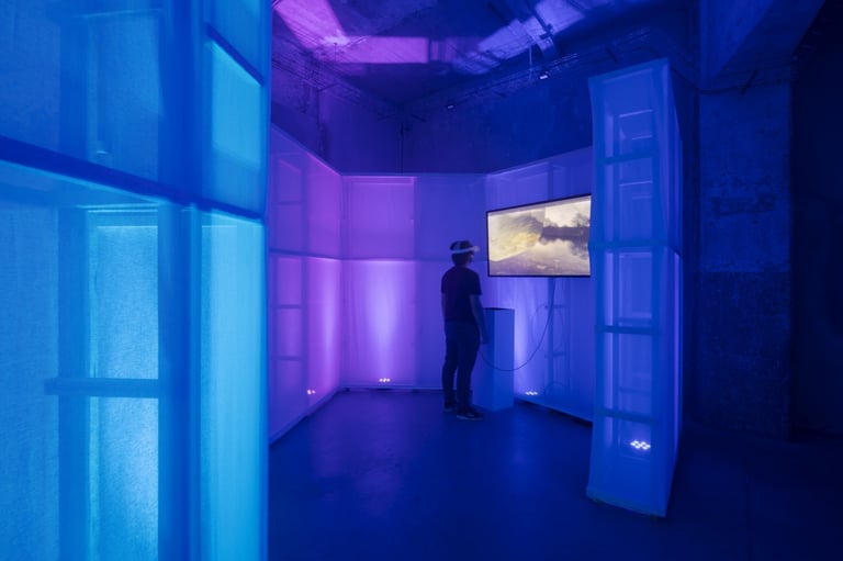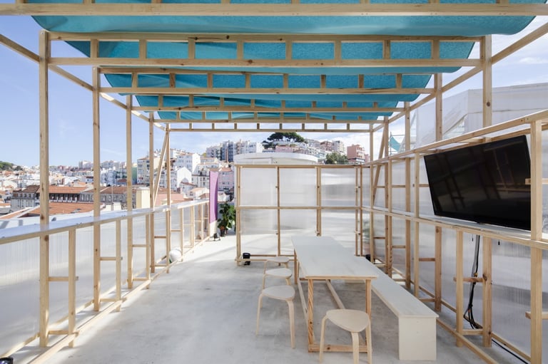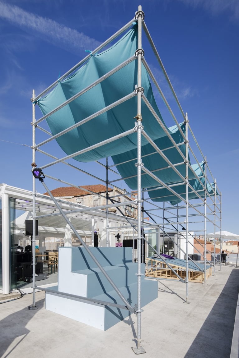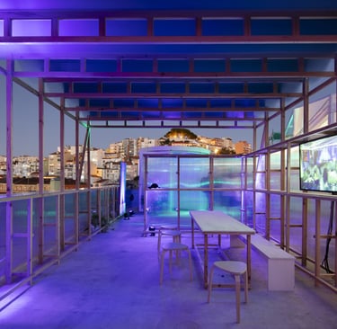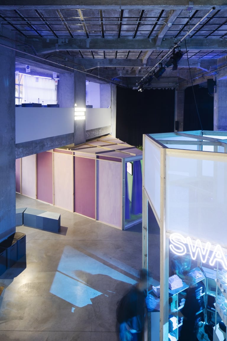 Des volumes simples et colorés s’insèrent dans un décor brutaliste pour rendre l’espace plus dynamique et abriter les nombreux éléments du programme tels qu’une scène, des salles de workshops et de conférences, une galerie NFT, une zone pour expérimenter la réalité virtuelle, une boutique, un espace lounge et une vaste terrasse en rooftop ouverte sur la ville.